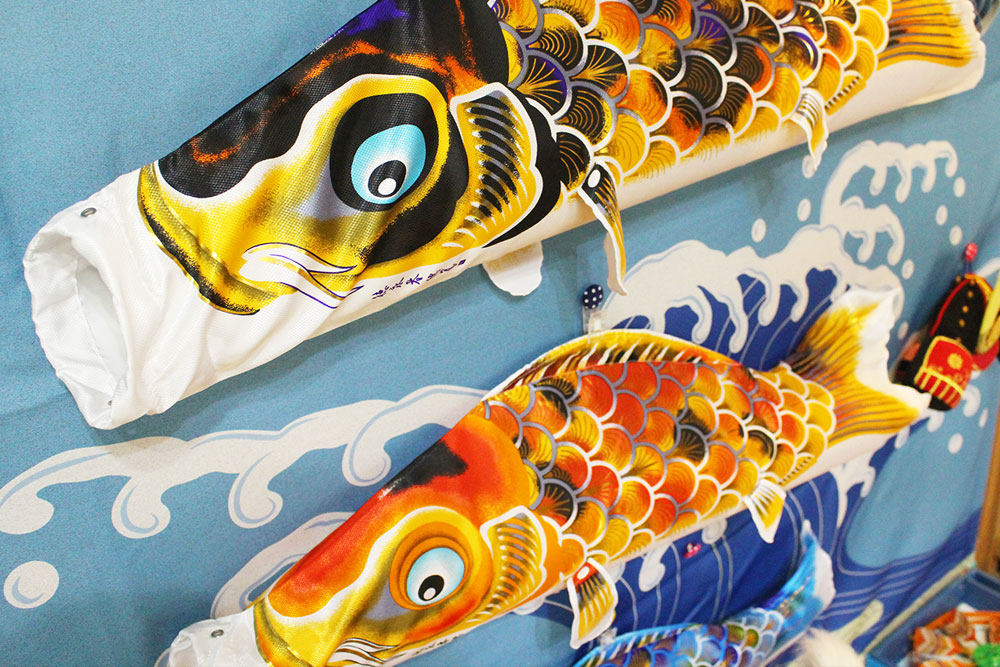 室内にも飾れるつるし飾りなどたくさんの節句幟も展示しております。